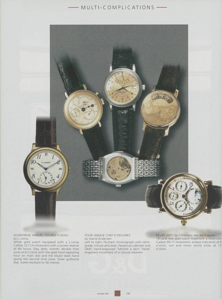 - Una muestra de fuerza de los talleres de Andersen Genève en 2001 (imagen central), con cuatro modelos de alta complicación, incluido un Montre à Tact grabado a mano.