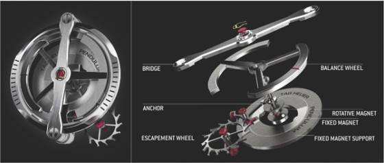 La investigación de TAG Heuer se centró en una técnica totalmente original: un dispositivo formado por cuatro imanes. Dos de estos imanes, uno positivo y uno negativo magnetizados, en una sola dirección, se mantienen cara a cara en el borde interior de un soporte redondo fijo de hierro dulce, formando así una especie de jaula de Faraday. En el centro, en el eje de la rueda con el apoyo de un puente tradicional, se situan dos imanes móviles cuya rotación alterna los pólos positivo y negativo, creando así un campo magnético en cada parte del dispositivo. Para que esto funcione, es necesario crear una forma especial para los imanes para que su fuerza sea «lineal» (ya que uno de los problemas con los imanes es que su fuerza disminuye muy rápidamente, de manera inversamente proporcional al cuadrado de la distancia) . También era necesario colocarlos en una posición precisa con el fin de controlarlos en tres dimensiones, lo que les permite por lo tanto aportar un par adecuado de regresión lineal para las oscilaciones alternantes del balancín. ¿Cuáles son las ventajas de este sistema? Hay varias. Los campos magnéticos no son sensibles a la gravedad o las perturbaciones, lo que elimina dos de los principales problemas del muelle de balancín tradicional. Además, la sencillez de su montaje facilita enormemente el trabajo del relojero. Por otro lado, hay un obstáculo grave, tal como fue reconocido abiertamente por Stéphane Linder, vicepresidente a cargo del marketing y el diseño de la marca -los imanes son muy sensibles a la temperatura, un problema que no ha sido todavía resuelto.