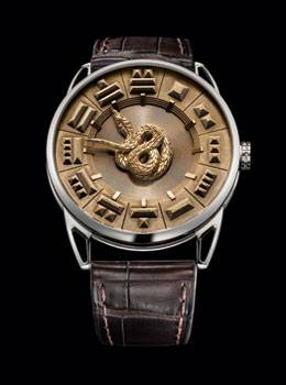 Quetzalcóatl bien podría ser el nombre más impronunciable del salón, pero sin duda era uno de sus más bellos relojes, inspirado como está por la famosa serpiente emplumada que se creía gobernaba el ciclo de tiempo en la era precolombina, divina protectora de los orfebres y artesanos e inventora del calendario. Ubicada en el centro de la esfera, la serpiente señala con la cabeza hacia las horas y con la cola a los minutos. Por lo tanto, se enrolla y desenrolla perpetuamente sobre una vista aérea de las ruinas del templo de la ciudad de Tenochtitlan, cuidadosamente tallada en relieve. En base a los diseños de David Zanetta, la grabadora Michelle Rothen ha logrado una obra maestra de la sutileza y delicadeza, reforzada por el juego sofisticado de la luz, ya sea en espumosos motivos guilloché o el resplandor de las superficies mate. Veinte ejemplos de esta maravilla están disponibles (110.000 CHF). |