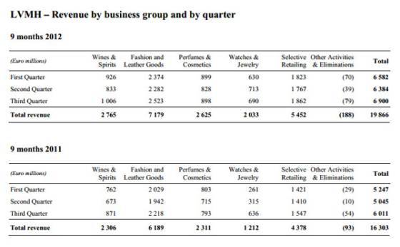 El Grupo ha registrado un aumento del 15% en sus ingresos para el tercer trimestre. El crecimiento orgánico de los ingresos fue del 6%, un buen desempeño en el entorno económico actual, sobre todo si se compara con los buenos resultados en el mismo periodo del 2011. El mercado de los EE.UU. siguió demostrando un sólido ímpetu. A pesar de un entorno empresarial mixto, Europa y Asia también han contribuido a la realización del tercer trimestre. Louis Vuitton sigue ganando cuota de mercado en todo el mundo.