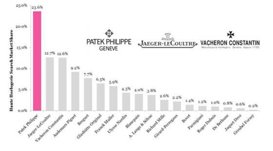 Patek Philippe sigue siendo, con mucho, la principal marca de relojes de alta relojería con el 23,6 por ciento de cuota en cuanto al interés por la marca. Jaeger-LeCoultre toma el segundo lugar con el 12,7 por ciento, seguida de cerca por Vacheron Constantin con un 12,6 por ciento, Audemars Piguet, con un 9,2 por ciento y por Breguet con el 7,7 por ciento.