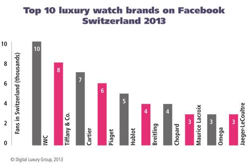 Por último, ¿qué pasa con el desempeño de las marcas de relojes de lujo suizos en Facebook? Las marcas Couture están, lógicamente, a la vanguardia en Facebook, ya que aprovechan su internacionalmente fuerte base de la moda. Sobre la investigación de las marcas fuera de esa categoría, las marcas están presentes desde la categoría Watch & Jewelry, la mayoría de las cuales tienen una base joyera. “Facebook es una realidad, pero no para todo tipo de comunicación, siendo el más adecuado para el contenido de moda mucho más consciente que marcas como Bulgari y Cartier tienen que ofrecer.«Al comentar sobre la ausencia de ciertas marcas icónicas en Facebook, James Gurney, Editor en Jefe de la QP , añade:»Patek Philippe, por ejemplo, no utiliza embajadores de marca en la forma en que lo hacen Omega, TAG Heuer o Cartier - Facebook trabaja para las noticias de usar y tirar y Patek no quiere eso."