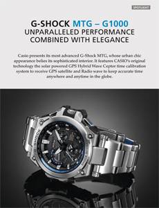 Además de su notable tecnología a bordo y a pesar de su capacidad para soportar las condiciones más duras, el G-Shock MTG-G1000 es sumamente elegante, con una estética muy refinada. Está acabado con los más altos estándares, lo que supone un aspecto clásico, arquitectónico y contemporáneo. Las superficies metálicas sobre la caja y el brazalete, en pulido espejo utilizando la técnica “Sallaz”, se alternan armoniosamente con toques de azul profundo, así como con el anillo de las ciudades ión-plateado, y la resina azul insertada en las partes metálicas del brazalete. La esfera, de alta visibilidad, protegida por un cristal de zafiro resistente a los arañazos, es muy legible a pesar de la rica variedad de las indicaciones que muestra.