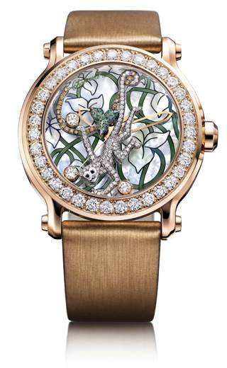 Reloj de oro rosa de 18 quilates para celebrar el 150º aniversario de Chopard y en apoyo de la World Wildlife Fund. Mono de oro totalmente pavonado de diamantes, esfera de madreperla, bisel con set de diamantes, diamantes móviles de Chopard, marca de la casa, agujas esqueletizadas, correa de satén con hebilla de oro rosa de 18 quilates. Existen 15 relojes en esta colección mostrando cada uno de ellos un animal diferente.