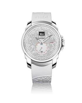 Caja de acero inoxidable, 45mm de diámetro, set de 70 diamantes,esfera blanca, diseño de sastre, correa de caucho blanca.