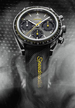 La apelación «Racing» se ha distinguido siempre por un “look” más deportivo dentro de la colección Speedmaster. Los modelos más recientes en esta línea combinan toques deportivos de color con un diseño más clásico de la relojería en forma de decoración Clous de París en las sub-esferas. Caja de acero inoxidable, diámetro 40 mm, certificado COSC, calibre Omega 3330 con rueda de pilares co-axial cronógrafo con reserva de marcha de 52 horas, correa de caucho negro con la inscripción Speedmaster en amarillo.