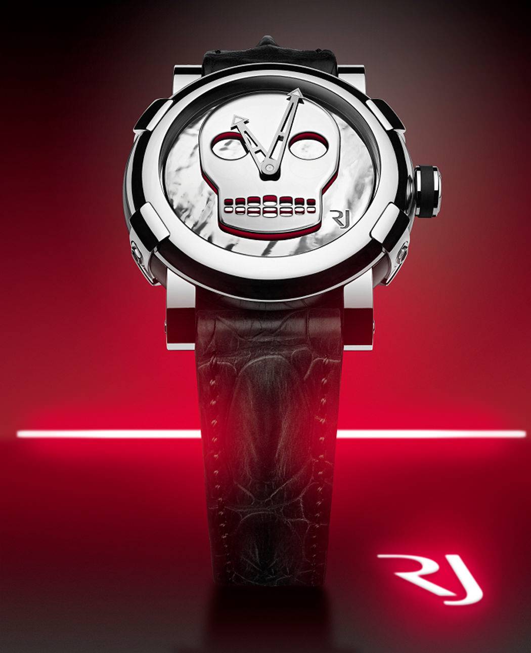 Dial: Esfera pulida y martilada. Motivo de calavera aplicado sobre la esfera. Parte inferior del aplique lacado con diferente color