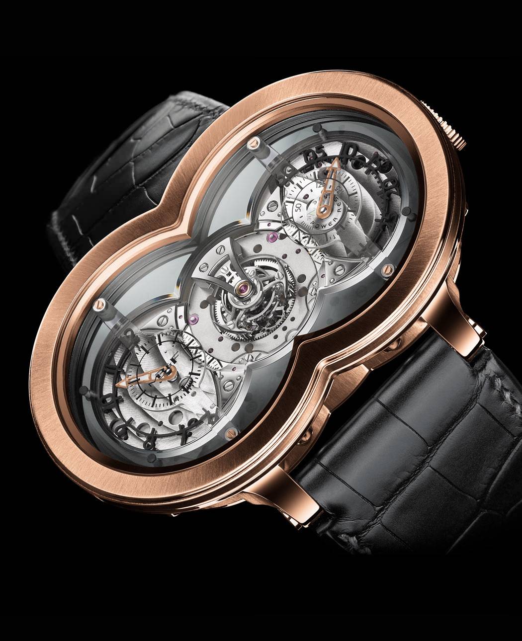 Tourbillon elevado central de un minuto, horas y minutos separados, reserva de marcha de siete días.