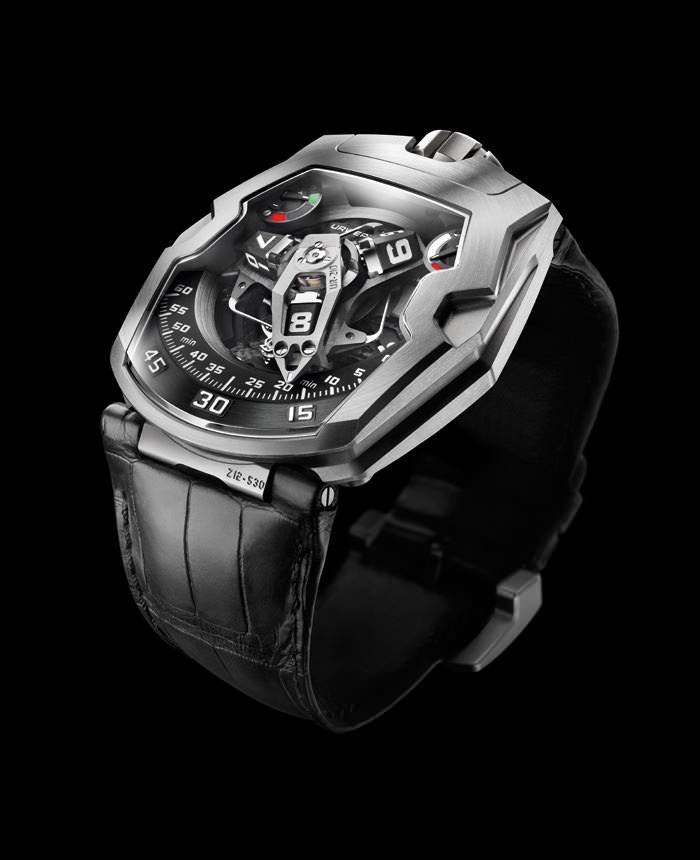 Esta máquina de 53.6mm x 43.8mm en titanio y acero muestra una indicación única desarrollada por Urwerk.En la esquina superior izquierda de la esfera hay un indicador que muestra la eficiencia de la cuerda en las últimas dos horas. Con su uso, el usuario puede ajustar la eficiencia de carga del movimiento automático calibre UR-7.10 utilizando un selector en la parte posterior del reloj. Las turbinas acopladas al movimiento, ofrecen una reserva de marcha de 39 horas, y manejan esta función, mientras la complicación satelital giratoria patentada de Urwerk muestra el tiempo alrededor de la mitad inferior de la esfera.