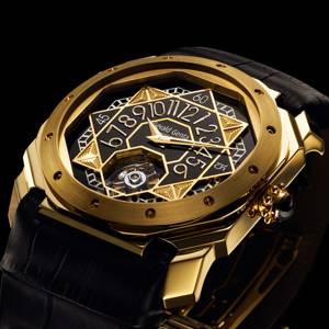Arquetipo de la modernidad introducido en la relojería por Gérald Genta, la mítica caja octogonal Octo reaparece en una versión Tourbillon Sunray. Las dos placas de oro amarillo que componen la esfera revelan la hora retrógrada sobre un fondo de laca negra, al tiempo que una abertura octogonal permite visualizar un torbellino que brilla por la finura de su construcción. El non plus ultra de esta deslumbrante composición, verdadera oda al sol, es el movimiento manufacturado y engalanado con oro viejo, con la firma de Gérald Genta llamada “Fini Potter”, emblemático de los movimientos de antaño.