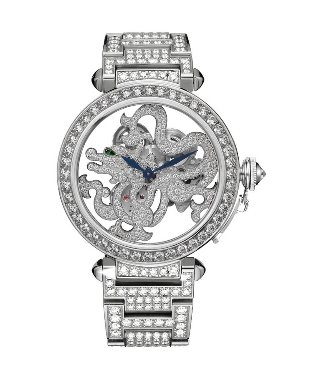 Movimiento: Movimiento mecánico de la Manufactura de carga manual, calibre 9617 MC, complicación de horas minutos con los puentes esueletizados formando la silueta de un dragón
