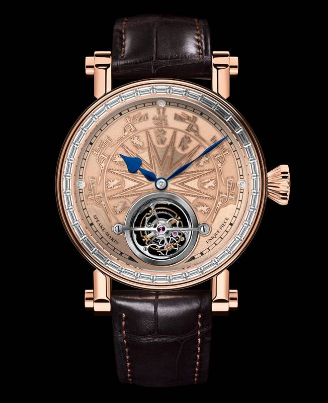 El Grand Diamond Magister Dong Son Tourbillon cuenta con una esfera de oro rosa de 18 quilates intrincadamente grabada con un motivo inspirado por los antiguos tambores de bronce Dong Son inspirados en los tambores de bronce prehistóricos de los antiguos Dong hijos de Vietnam. Los biseles pulidos dirigen la vista hacia la animación de 60 segundos del tourbillon. El Diamond Magister Dong Son es una pieza única de una serie de 8 relojes tourbillon con este diseño. La esfera meticulosamente detallada se complementa con la caja Speake-Marin Piccadilly con forma de tambor en oro de 18 quilates de color rojo.