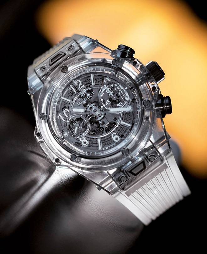 Después de varias series de relojes totalmente negros y opacos, Hublot va en la dirección contraria, centrándose en la transparencia absoluta. Bisel, la caja, tapa trasera y cristales: la caja del Big Bang Unico Sapphire está enteramente hecha del material más duro de la industria relojera: el zafiro. De hecho, es tan duro que sólo el diamante lo puede rayar. Uno puede imaginar por lo tanto fácilmente la dificultad de mecanizado para hacer una caja y los cientos de horas de producción requeridas - especialmente con las formas complejas del Big Bang. El calibre de la Manufactura Hublot UNICO que aparece debajo de la esfera transparente y visible desde todos los ángulos nunca ha sido tan plenamente revelado, incluyendo su rueda de pilares a las 6 en punto. Esta serie limitada de 500 piezas anuncia una nueva era para las cajas de zafiro.