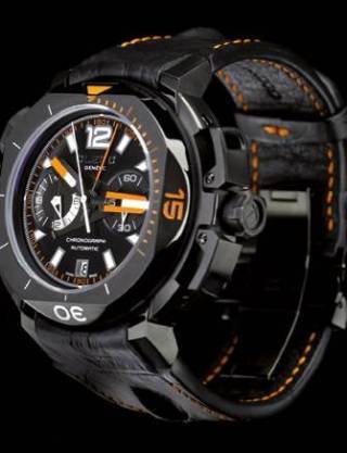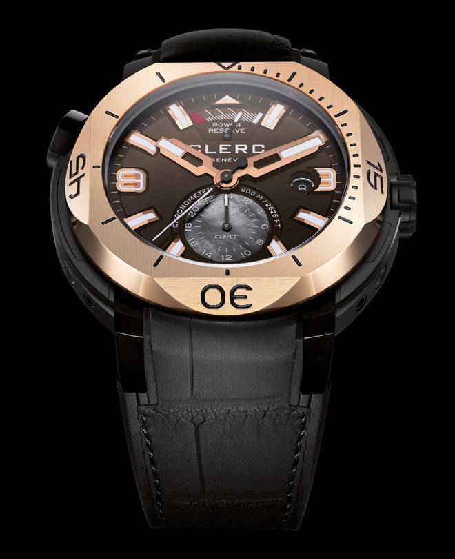 Con sus 83 componentes, la caja del Hydroscaph GMT Power-Reserve Chronometer es una de las más complejas. También está a la altura de las demandas de los buzos profesionales con una resistencia al agua de hasta 800 metros. A esto se suma un sistema de bloqueo del bisel giratorio por medio de una segunda corona a las 10 en punto para evitar esta herramienta vital de submarinista se active de forma accidental. El bisel de oro rosa con sus cuatro esquinas inclinadas es también una característica de la marca Clerc. Su movimiento es un cronómetro automático certificado oficialmente que muestra una segunda zona horaria en un contador de madreperla. la ergonómica caja, en oro rosa o acero con tratamiento DLC negro, hace una fuerte declaración con su generoso diámetro de 48 mm. Sus cuernos móviles garantizan un excelente confort en la muñeca.