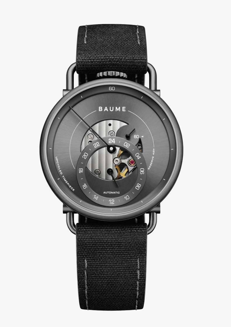 Movimiento: Miyota 82d7; automático; reserva de marcha: 42 horas; Caja: 41 mm, en aluminio con fondo de zafiro abierto. Esfera: esfera plateada con acabados satinados y en patrón solar; aguja negra e índices blancos. Correa: correa negra para mascotas reciclada con un sistema autointercambiable con botones reciclados.