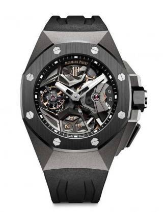 Movimiento: De cuerda automática, propio de la Manufactura Calibre 3120, reserva de marcha 60 h. Tipo de masa oscilante: Monobloque en oro de 22 quilates. Caja: Caja de acero inoxidable, cristal y fondo de zafiro antirreflejos, coronas de color púrpura con cierre de rosca. Esfera: Esfera morada con patrón «Méga Tapisserie», marcadores horarios aplicados en oro blanco y agujas Royal Oak con recubrimiento luminiscente, bisel interior giratorio morado con zona de 60 a 15 minutos en blanco.