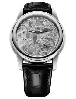 Prestige HMS Stainless Steel - El primer reloj de la serie de Romain Gauthier en este material - presenta una impresionante esfera hecha a partir de un extraordinario meteorito de Henbury que presenta bandas de cristal de níquel y hierro que se deslizan de manera excepcionalmente gruesa y brillan espectacularmente cuando el usuario da vuelta el reloj.