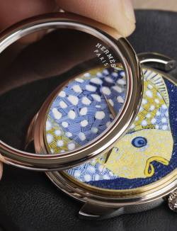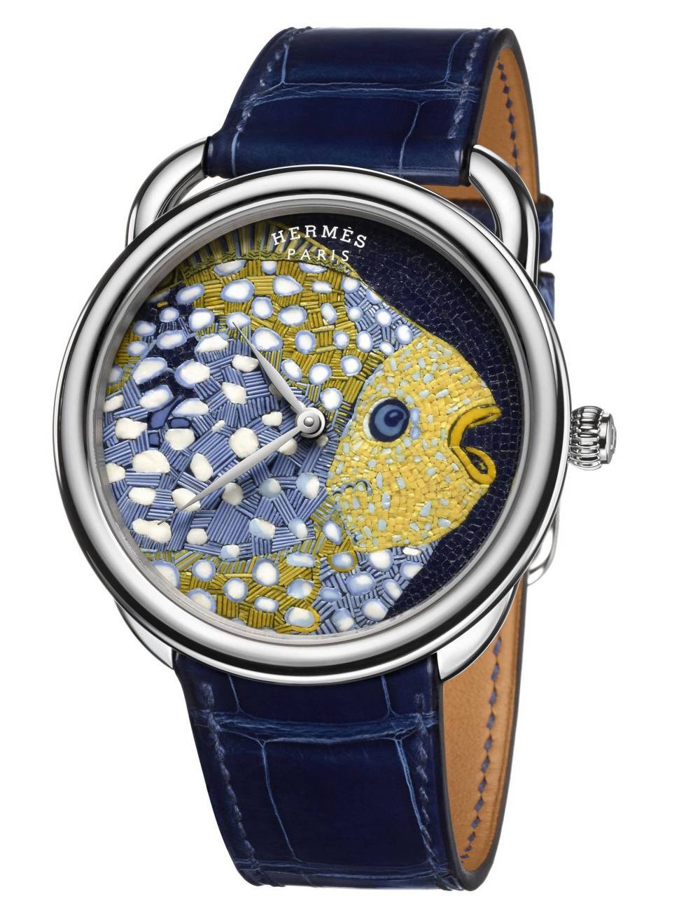 Diseñado en 1978 por Henri d’Origny, el reloj Arceau presta sus líneas discretas pero distintivas a la experiencia y creatividad de las artesanías artísticas. Su caja redonda con cuernos con forma de estribo enmarca una esfera de micromosaico de vidrio. Sobre el fondo azul turquesa destaca un pez exótico de colores brillantes que representa el tema del pañuelo «Grands Fonds» diseñado en 1992 por la artista Francesa Annie Faivre. Su técnica rigurosa y su abundante imaginación se reflejan en este microcosmos de vidrio coloreado creado por los artesanos de Hermès Horloger.