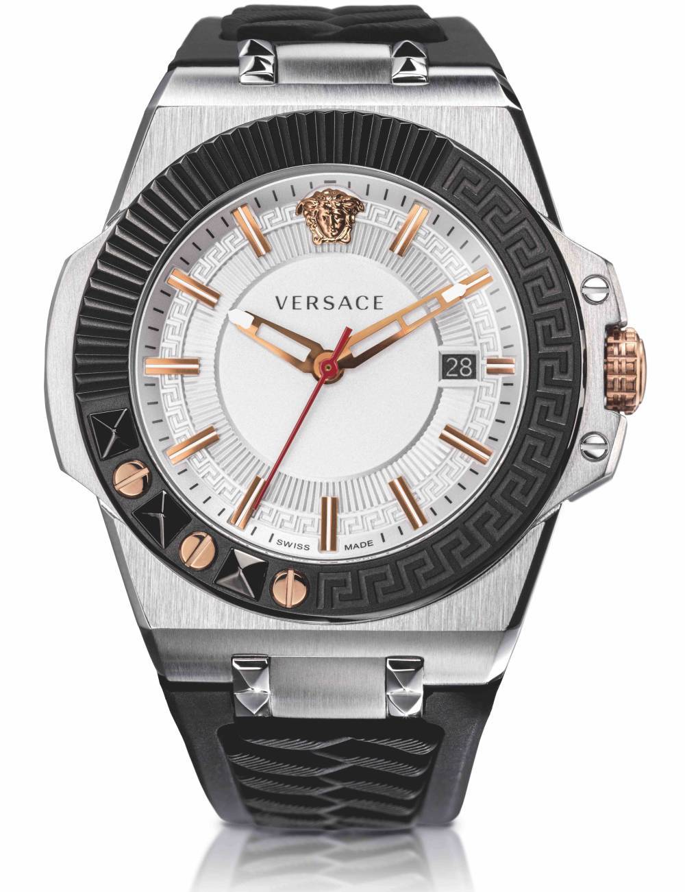 El logotipo de Versace y una Medusa tridimensional en la esfera a las 12 en punto agregan un toque de marca a este estilo masculino.