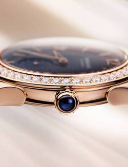 El Tonda Métropolitaine aventurine está equipado con el movimiento automático patentado PF310 con una masa oscilante dorada, y presenta una caja de 36 mm de diámetro combinada con un bisel engastado con 46 diamantes IF con un total de 1,8 quilates. IF significa “Internally Flawless” y designa uno de los grados más altos posibles en la escala de claridad: el de un diamante puro visto con un aumento x10. La esfera de aventurina de este reloj evoca el centelleo de un cielo nocturno claro, con cada una de las inclusiones de cobre que ilustran el rico resplandor de la luz de las estrellas. Las manecillas de hora y minutos esqueletizadas tienen forma de hojas de salvia, y el segundero pequeño se ajusta a las seis en punto. Un cabujón de zafiro azul adorna la corona. Una correa de cocodrilo Hermès Blue Indigo completa este lujoso reloj