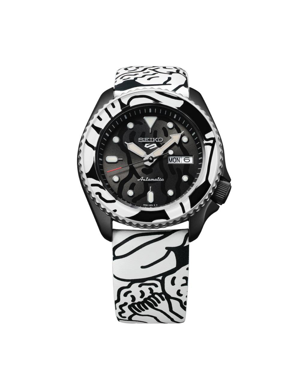 La esfera de color negro presenta el motivo icónico de AUTO MOAI «figuras sin rostro». La correa de piel está impresa con ilustraciones diseñadas exclusivamente para los relojes de colaboración.