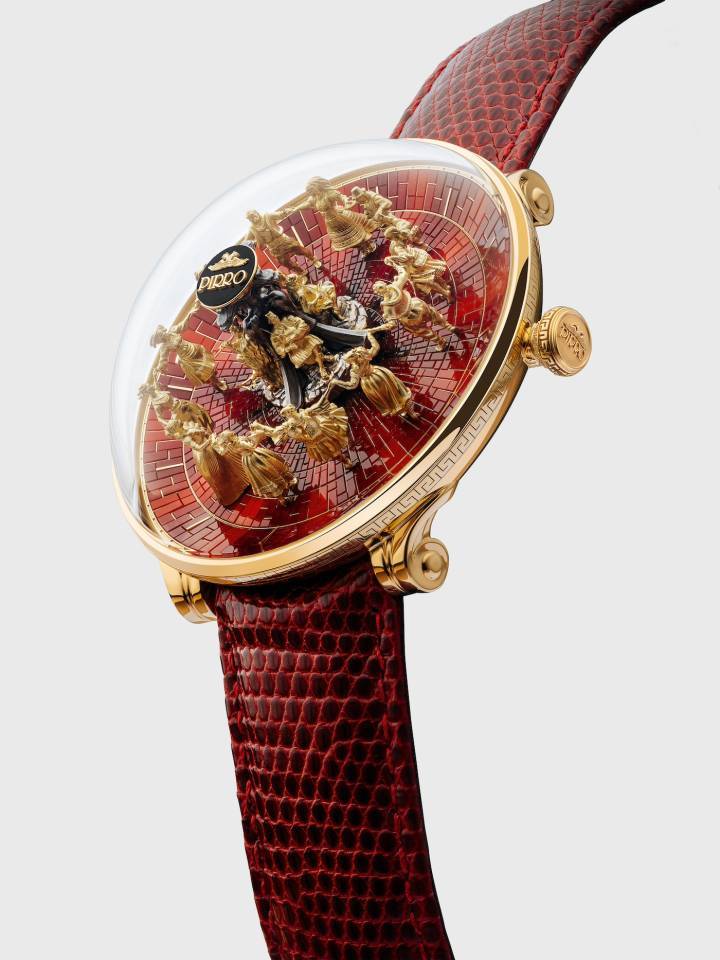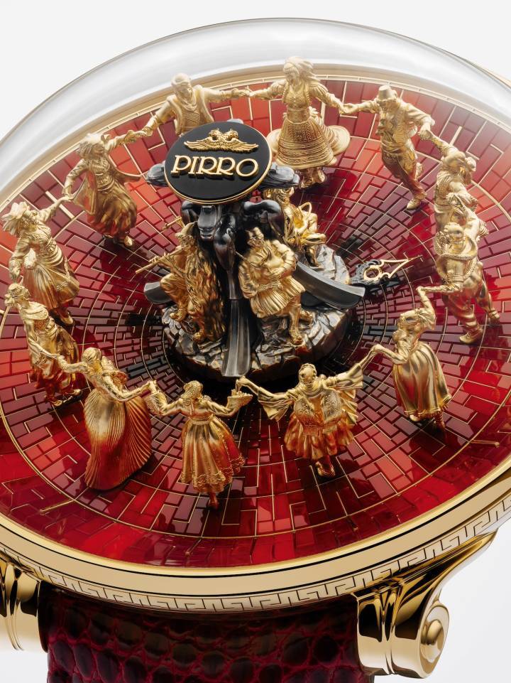 La esfera está compuesta por un micromosaico artístico en degradado rojo-negro de piedras de cristal de Murano, compuesto por 1500 piedras en ocho colores diferentes y 64 cortes, la más pequeña de tan solo 0,2 mm. El degradado y la textura de la marca se ajustan en función de sus tonalidades para indicar las horas. El fino patrón geométrico de oro de la esfera, que encierra las piedras del micromosaico, forma el motivo de la marca Pirro. La tapa trasera refleja la escena ilustrada con los bailarines folclóricos grabados en microrelieve.