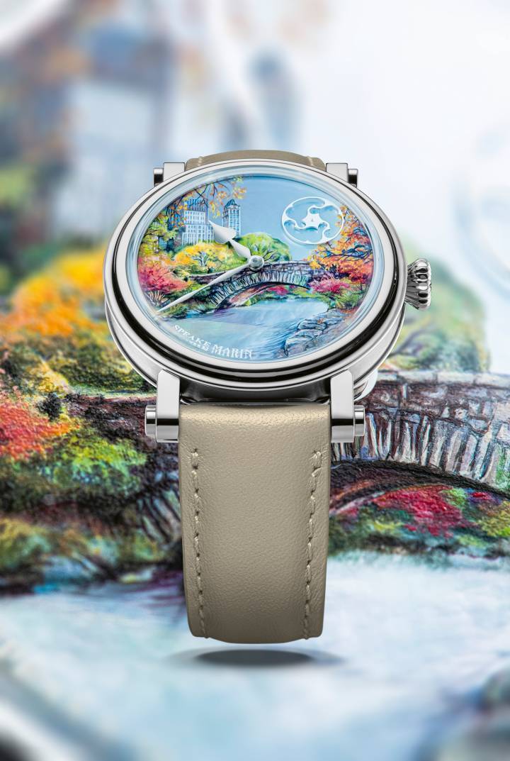 Speake Marin, que participa por segunda vez en la subasta benéfica TimeforArt organizada por el Swiss Institute of New York en apoyo del arte contemporáneo, ha creado un reloj único para su colección Art Series, titulado Promenade à New York (Un paseo por la ciudad de Nueva York). El reloj está inspirado en los recuerdos de la directora ejecutiva de Speake Marin, Christelle Rosnoblet, que recuerda su prolongada estancia en Nueva York. La exquisita esfera de nácar sirve de lienzo sobre el que cobran vida los recuerdos de sus tranquilos paseos dominicales por Central Park. En el centro del diseño se encuentra una magnífica micropintura del pintoresco puente de Gapstow, cuyos intrincados detalles han sido hábilmente capturados y realzados por la artista. La obra de arte representa el puente en medio de una evocadora escena otoñal, con follaje en tonos dorados, bronce y naranjas, sobre un cielo azul nítido, imponentes rascacielos y brillantes reflejos en el agua. El proceso requirió más de 100 horas de trabajo meticuloso para completarlo.