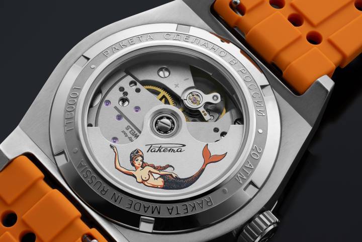 El corazón del Raketa Amphibia es su movimiento automático, fabricado de principio a fin en la Fábrica de Relojes Raketa de San Petersburgo. El rotor del movimiento está adornado con la imagen de una sirena, diseñada al estilo de las ilustraciones de los cuentos de hadas Rusos.