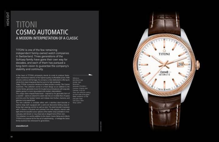 La nueva colección está disponible con un brazalete de acero inoxidable o correa de cuero, ambos equipados con un cierre desplegable sólido y decorativo que ofrece un alto nivel de comodidad y estilo. El brazalete de acero impresiona con una mezcla de eslabones cepillados y pulidos que interactúan juguetonamente con la luz, mientras que las bellas opciones de color de la correa de cuero (disponible en gris carbón, marrón oscuro o azul marino) establecen un tono elegante propio. Esta colección es una valiosa adición a la serie clásica Cosmo y refleja la verdadera pasión de Titoni por el arte de la relojería, una herencia que el negocio familiar Suizo ha acogido por generaciones.
