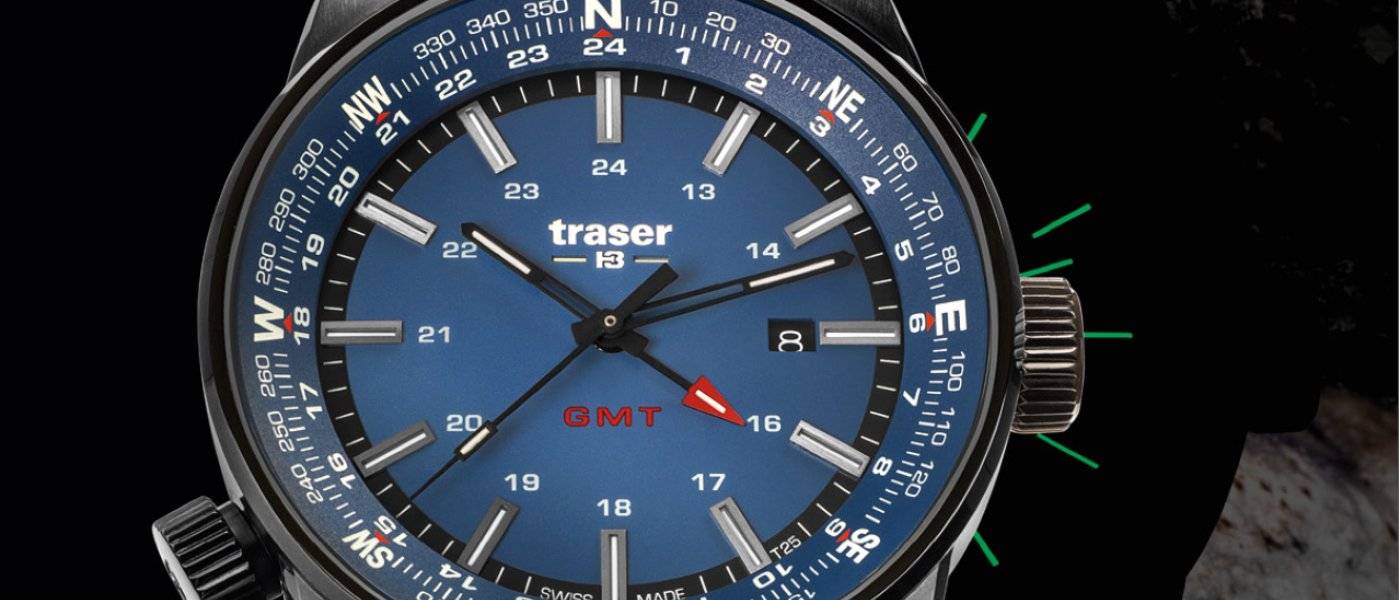 l P68 Pathfinder GMT del pionero relojero Traser es el compañero ideal para cualquier persona que tenga más de un hogar. El nuevo reloj GMT con anillo de brújula integrado no solo muestra la hora en dos lugares diferentes, sino que también indica el camino, de día y de noche.