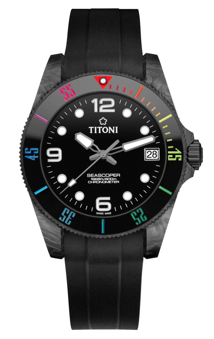 a combinación de carbono negro, que hace que cada reloj sea un original inconfundible, con el bisel de cerámica negra resistente a los arañazos es un punto culminante del diseño que le da al nuevo buceador de Titoni, el Seascoper 600 CarbonTech, un aspecto particularmente deportivo y moderno. El bisel pulido como un espejo contrasta con el acabado de carbono mate.