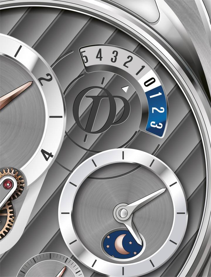 La esfera principal a las 11 en punto indica horas y minutos, como era de esperar. Una abertura semicircular a la 1 en punto revela un número (identificado por un triángulo blanco) que se puede seleccionar a través del pulsador superior a la izquierda de la caja. Cada número del 0 al 12 corresponde a una zona horaria, con las horas de luz sobre un fondo gris claro y las horas de la noche sobre un fondo azul oscuro. Las horas y los minutos en la esfera auxiliar a las 4 horas corresponden a una zona horaria diferente, que se puede configurar de la siguiente manera: una vez seleccionada la hora con el pulsador superior izquierdo, se puede activar el pulsador inferior izquierdo para sincronizar automáticamente la hora de la segunda zona horaria. El pequeño disco insertado en la esfera auxiliar proporciona confirmación de día/noche. Los segundos se muestran en una pequeña subesfera a las 6 en punto.