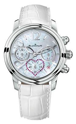 El modelo femenino de Blancpain, “Saint-Valentin 2009” revela su belleza interior con asombrosa simplicidad. Alberga un calibre F185 que le da vida a las funciones del cronógrafo, hora, minutos y pequeños segundos, al igual que el indicador de la fecha. Este complejo mecanismo puede ser operado delicadamente gracias a los pulsadores al costado de la caja, de un modo que solo puede ofrecer un sistema de ruedas encolumnadas; detalle exclusivo que lo ubica entre los cronógrafos de la Alta Relojería.