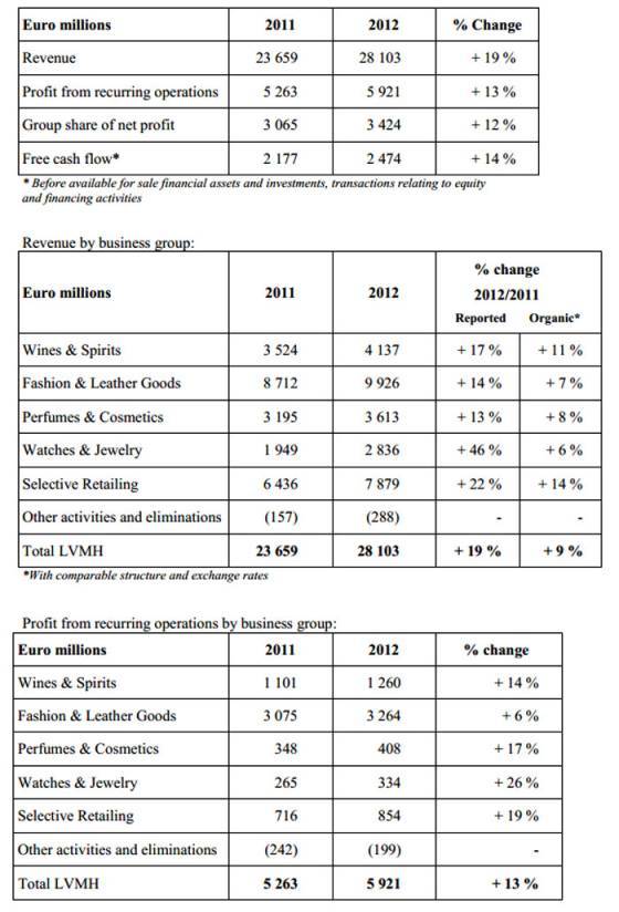 LVMH Louis Vuitton Moët Hennessy, uno de los principales grupos de artículos de lujo del mundo, registró unos ingresos de 28,1 mil millones de Euros en 2012, un aumento del 19% con respecto al 2011. Esto incluye la integración de Bulgari a 30 de Junio del 2011. El crecimiento orgánico de los ingresos fue del 9%. Todos los grupos empresariales vieron un excelente impulso en Europa, Asia y Estados Unidos. Louis Vuitton, en particular, volvió a registrar un crecimiento de dos dígitos en los ingresos durante el año.