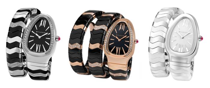 A pesar de que es la combinación de estos iconos simbólicos, uno en representación de la seducción y el otro del sustento, que están uxtapuestos en el corazón del Serpenti Spiga. La colección combina el dominio de la relojería para la mujer. Con un movimiento de cuarzo fabricado en Suiza, el Serpenti Spiga mantiene la hora perfecta dentro de su caja de 35 mm de oro rosa de 18 quilates o en acero pulido. Con su corona engastada con una preciosa piedra de rubelita rosa, el Serpenti Spiga añade un toque del estilo Bulgari, la joya para adornar su noble cabeza. Disponible en combinaciones de acero con cerámica blanca, acero, cerámica negra con diamantes, oro rosa, cerámica blanca con diamantes, o incluso una de cerámica negra, con diamantes y doble espiral de oro rosa en la muñeca, cada miembro de la familia Serpenti Spiga es sorprendentemente atractivo. Con fondos lacados en blanco o negro brillando tras las horas, el tiempo está marcado por la historia con los Numerales Romanos.