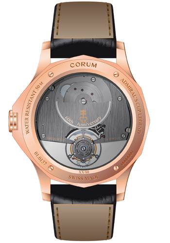 Desde la parte trasera, la vista a través de la parte posterior de cristal de zafiro es igualmente panorámica. En lugar de un rotor completo convencional que pueda impedir la visión del tourbillon, el calibre CO 016 está equipado con un micro-rotor decorado con el logotipo de Corum en oro de 18 quilates de color rojo.