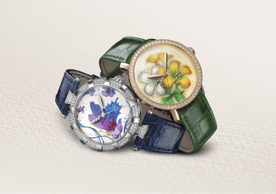 El reloj joya Golden Afternoon es muy conocido por su esfera de flores en marquetería de madreperla. Cuenta con un delicado diseño de mariposas y flores, con las agujas de las horas y y los minutos, en forma de alas de ángel finamente esculpidas. Su esfera tintada de azul y violeta adorna una caja de oro blanco engastada con diamantes redondos y mejorada con una brillante correa de cocodrilo azul.
