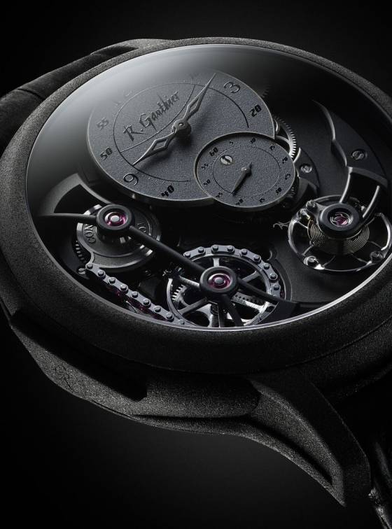 Las platinas y puentes del movimiento, por ejemplo, son creados a mano, con biseles redondeados y rubíes avellanados creados a mano. Hasta ahora bastante tradicional, realmente. Pero lo que es único es que Gauthier ha decidido tratarlos con un acabado negro mate muy poco tradicional. No es sólo que se vea interesante, sino que también absorben la luz.