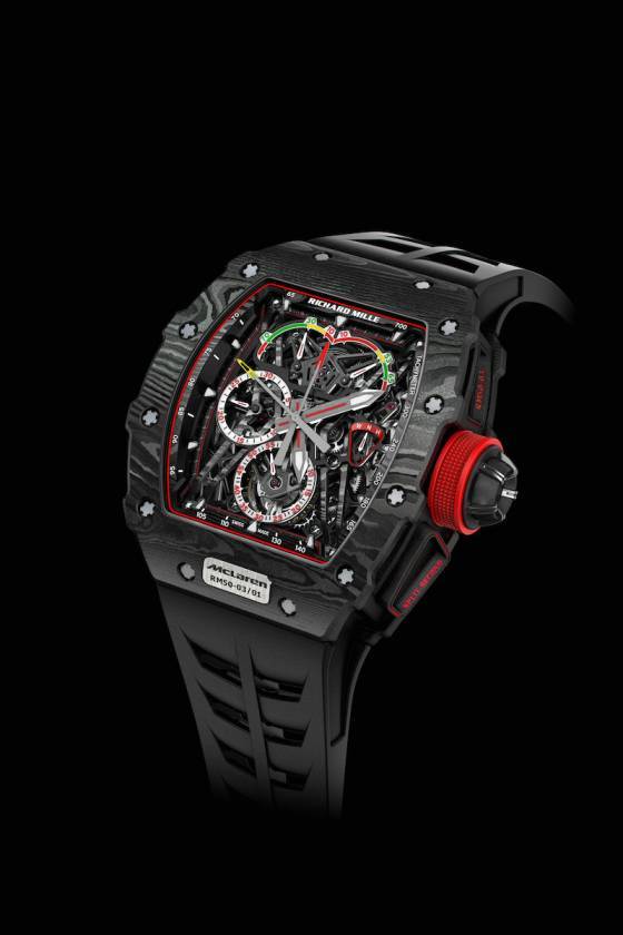 Otra de las creaciones ultra ligeras de la marca es el nuevo RM 50-03, del que se dice que es el cronógrafo mecánico más ligero de la historia, y que es el resultado de la colaboración con el gigante de la Fórmula 1 McLaren.