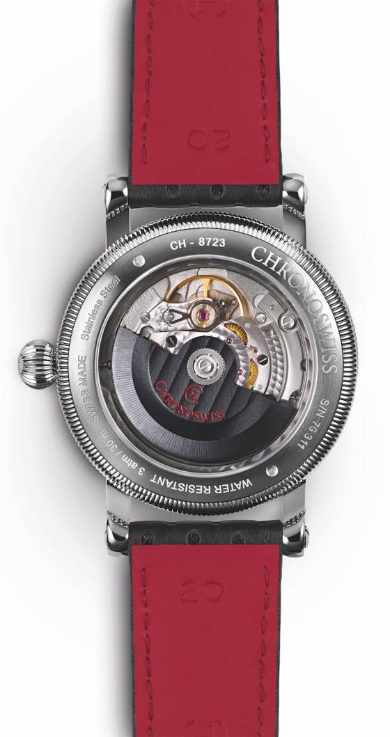 En el reverso, podemos apreciar el rotor galvanizado negro del movimiento automático a través del cristal de zafiro trasero. Este modelo en particular está propulsado por el Calibre Chronoswiss C. 291, que está protegido por una caja de tamaño modesto de 40 mm.