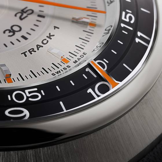 Ahí es donde el look neo-retro del Track1 se vuelve realmente evidente. Los diseñadores han combinado con éxito elementos de los cronómetros icónicos, y me recuerda a los tableros de instrumentos que se pueden encontrar en los coches clásicos de los años 1960 y 1970. La caja en forma de tonneau de 43 mm de titanio grado 5 también se añade a la sensación de años setenta de la pieza.