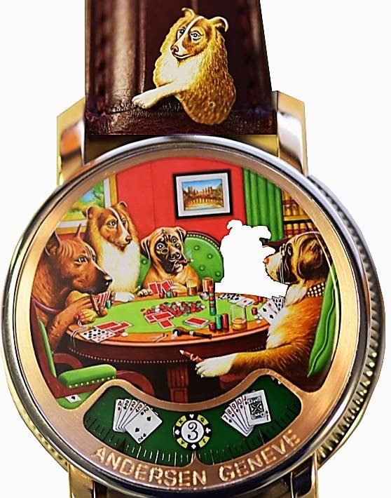 Gracias a esa complicación, la esfera se libera para servir como un lienzo que ofrece una amplia gama de personalización para los clientes. Uno de los modelos más peculiares de la colección Montre à Tact luce a unos perros jugando al póker.
