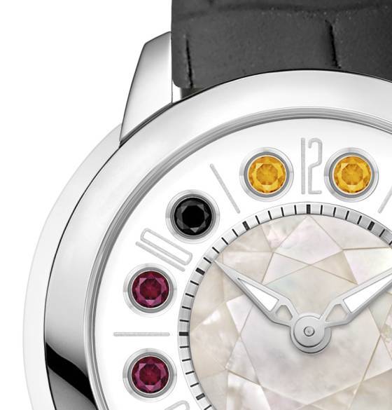 Pero también disfruto el simbolismo detrás de la complicación. Mientras que una corona como la conocemos generalmente se utiliza dar cuerda a un reloj o ajustar la hora o la fecha, aquí la corona manipula las presentaciones de gemas en la esfera. Siendo un reloj de lujo, es lógico que el papel principal de la corona esté fundamentalmente ligado a la operación de las joyas en lugar de a las agujas que dan la hora.