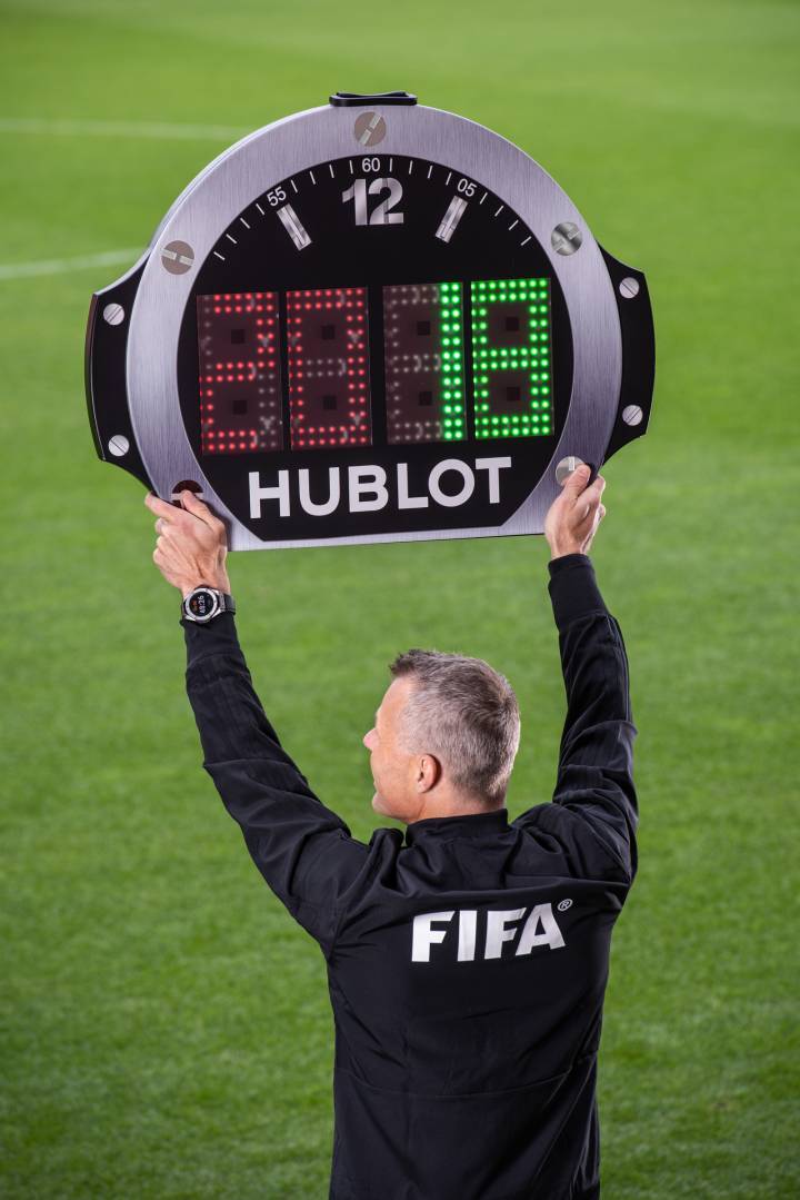 El fútbol fue la clave de la fama mundial de Hublot. En 2004, nadie había oído hablar de nosotros. Tuvimos que hacer un gran revuelo. La idea brillante era interesarse por el fútbol, un dominio en el que ningún relojero se había atrevido a poner un pie antes. Las cosas han cambiado mucho desde entonces (risas). La idea más brillante de todas fue sugerirle a la FIFA que ocupáramos el tablero de los árbitros y darle la forma de un reloj, porque el nombre Hublot no significaba nada para mucha gente. Podría haber sido cualquier cosa, un banco, una compañía de seguros.