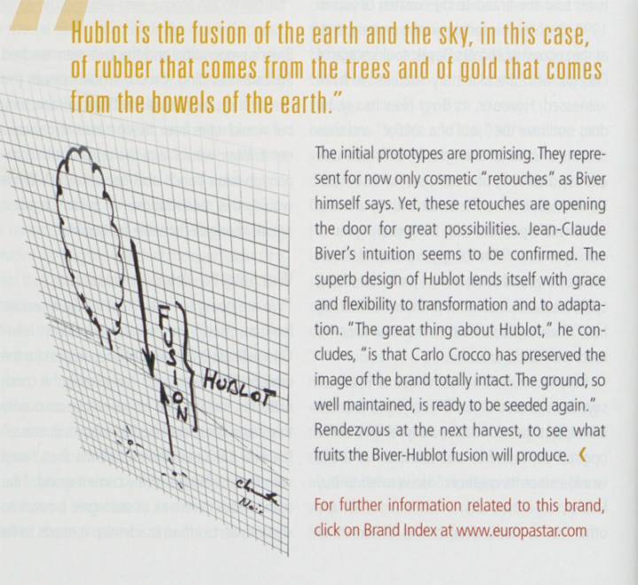 Jean-Claude acababa de tomar el timón en Hublot, asumiendo el apoyo del propietario Carlo Crocco, que estaba pensando en distanciarse gradualmente de su compañía. El potencial de desarrollo era enorme. Biver lo resumió de inmediato con la conocida palabra, la famosa «fusión» que resume lo que somos y lo que todavía estamos persiguiendo.