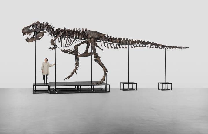 - TRX-293 TRINITY Esqueleto completo de Tyrannosaurus rex Cretácico superior, 65–67 millones de años Tres sitios de excavación en las formaciones Hell Creek y Lance Creek en Montana y Wyoming 11,6 × 3,9 × 2,65 m
