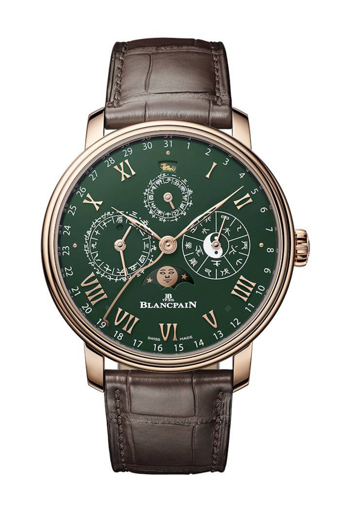 La esfera ha sido creada en esmalte grand feu totalmente cocido, y su color verde armoniza con la caja de oro rojo de 45 mm. Para facilitar el ajuste del calendario, la caja presenta correctores debajo de las asas patentados por Blancpain que no sólo liberan los flancos de los hoyuelos del corrector sino que también permiten cambios en las puntas de los dedos. Al igual que otros mecanismos de calendario de Blancpain, el calendario chino implementa un diseño seguro que elimina el riesgo de daños si el ajuste se realiza durante un cambio automático.