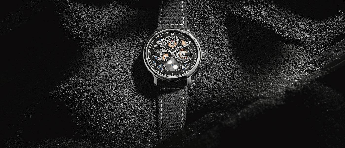Si hay una palabra que resume la Slimline Perpetual Calendar Manufacture diseñada por Peter Speake es “calado”. El relojero Británico ha aportado un toque etéreo y contemporáneo a Frederique Constant. Se han recortado superficies sólidas para revelar el funcionamiento más interno del movimiento Manufacture. Todas las esferas han sido esqueletizadas, al igual que las agujas (a las que se les ha aplicado un revestimiento luminoso), revelando el ballet mecánico del calibre FC-775 en todo su esplendor; El segundero se ha eliminado por completo para preservar el espíritu asertivamente funcional.