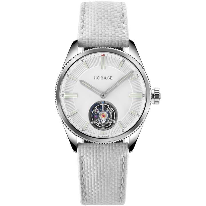 En general, la estética de la esfera y la caja aporta un aspecto más brillante y veraniego a la serie. La esfera blanca con el logotipo de Horage negro y apliques suizos Super-LumiNova blancos, junto con la piedra de ónix negro en la corona y la correa de caucho blanca tejida rinden homenaje a estas nuevas cámaras de colores más vibrantes.
