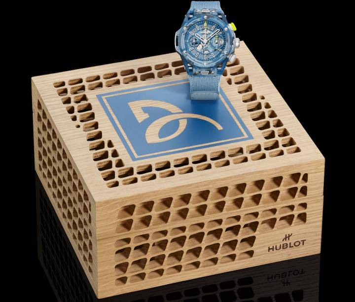 El compuesto que forma la caja y el bisel del reloj está hecho de resina epoxi reforzada con polvo de cuarzo y velo de vidrio que se ha fusionado con las raquetas y camisetas recicladas. El material resultante está salpicado de fragmentos de tejidos de color azul claro y oscuro y carbono negro para crear una estética de camuflaje singular. Un enfoque innovador, representativo de la ambición de Hublot por reinventarse sin fin.